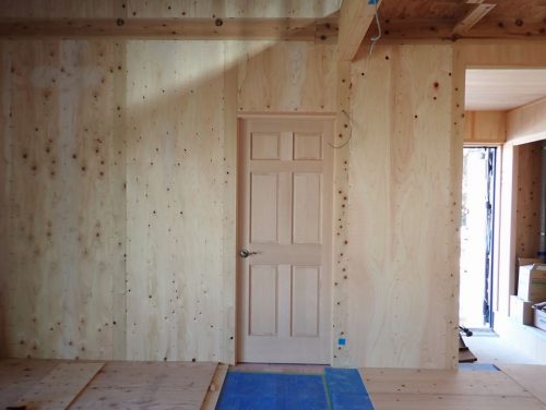 下の写真は、R様邸のリビングと洋室の間に入る建具です。今回は、いつもとは少し違い、アメリカのシンプソン社製の木製建具を採用しています。