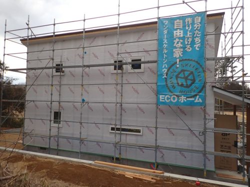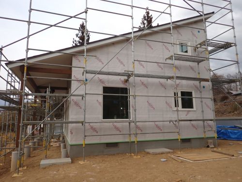 続いてR様邸の外観です。写真ではほとんど見えませんが、白い防水シートの上にラス網という細かい金属製の網を、建物全体に貼り終えています。この後、この上からモルタルを塗っていきます。