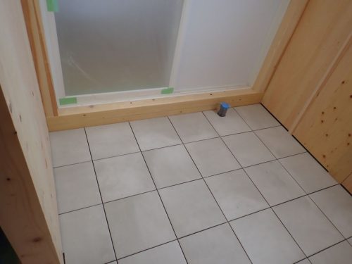 こちらは洗面室の様子です。キッチンと同じタイルを貼っています。キッチンも洗面室もこれで完成ではなく、この後、目地を埋めて仕上げていきます。