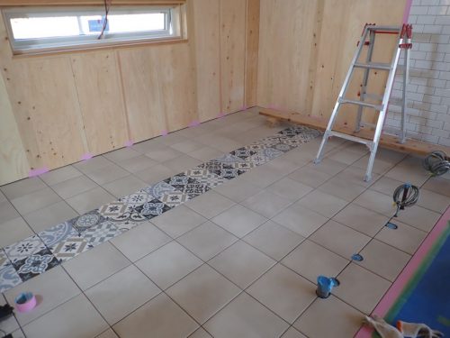 昨日に続き、タイル工事が進んでいます。下の写真はキッチンの床です。キッチンの通路になる場所の中央に、お客様支給のデザインタイルを貼り終えたところです。タイルのデザインは4種類あり、その並べ方はR様に絵を描いていただき、指示していただきました。かわいらしいタイルで、完成が今から楽しみです。