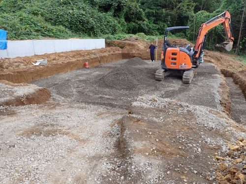 下の写真は、床掘りした地面の上に砕石を入れている様子です。