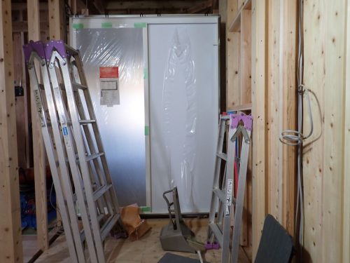 R様邸の家づくりも、順調に進んでいます。下の写真は、洗面室から浴室方向を撮影したものです。ユニットバスの設置工事が終わっています。