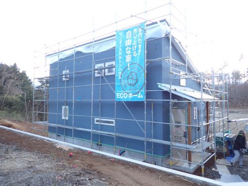 スカイブルーの外壁仕上げ材(一度塗り目)~田園を借景する平屋ワンダースケルトンハウス@北杜市2026年3月4日