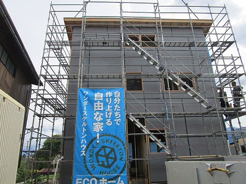 ECOホームの外断熱工法では、75ミリ厚の高性能の断熱材(カネライトフォームスーパーEX)で家全体を包み込んでいきます