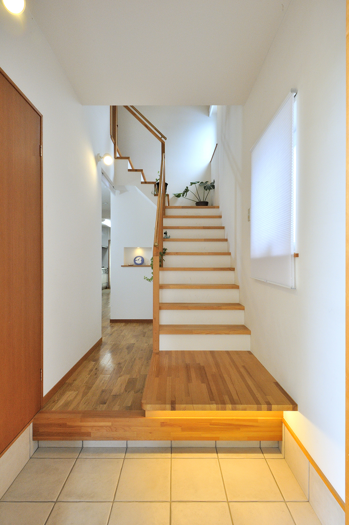 2階の仕事部屋には来客があるため、段差を利用した演出のある玄関スペースに仕上げました。