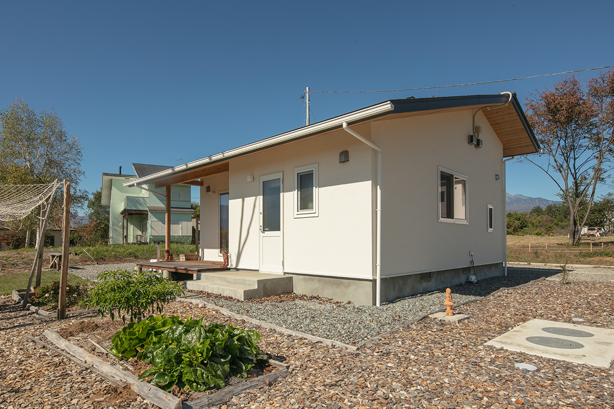 ミニマムハウスの南側外観。杉の無垢材を使った長めの軒天、ベルアートの塗り壁が、味わいのある雰囲気に仕上げています。