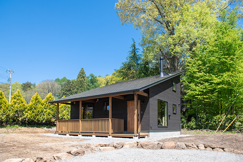 南側外観。焼杉の外壁が落ち着いた佇まいを見せているコンパクトな平屋建て。片流れ屋根の右側についている黒い筒は、薪ストーブの煙突です